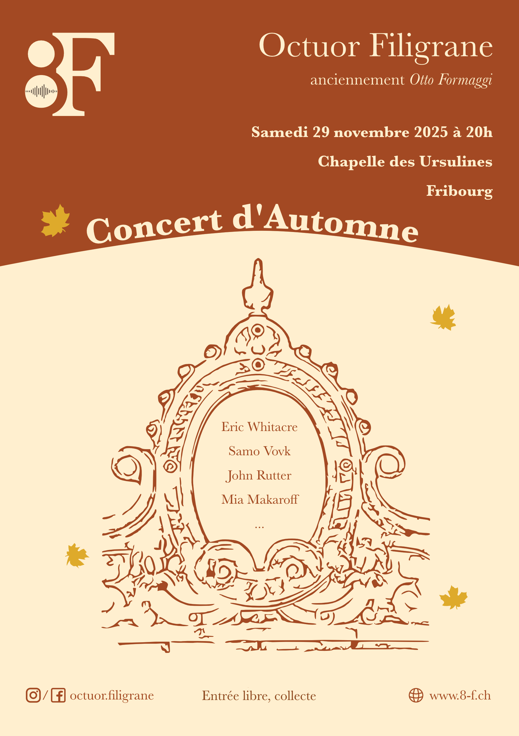 L'Octuor Filigrane (anciennement nommé Otto Formaggi) vous invite cordialement à son concert d'automne à la Chapelle des Ursulines à Fribourg. L'ensemble propose un programme a cappella varié, en passant des grands classiques comme Autumn Leaves ou Lullabye de Billy Joel, aux harmonies douces et cinglantes de Eric Whitacre, agrémenté de quelques pièces qui annoncent l'arrivée de la période de l'Avent.